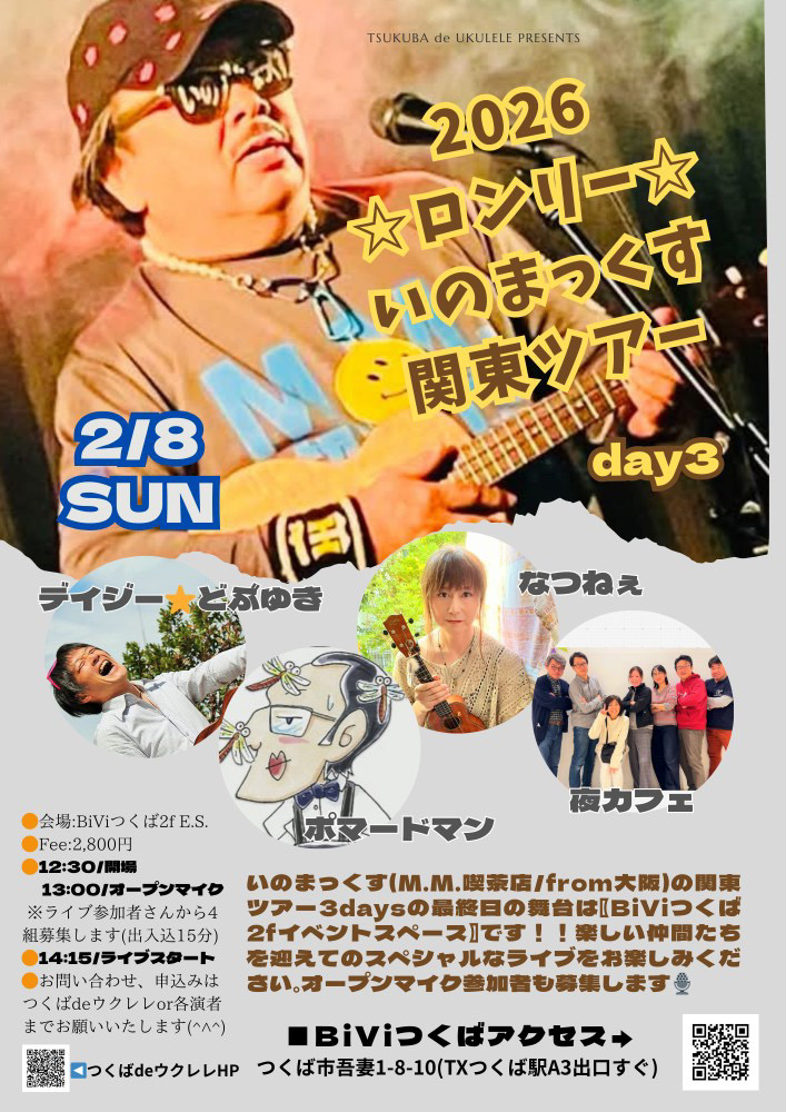 2月8日(日)<☆ロンリー☆いのまっくす関東ツアー DAY3> 未分類 2026.01.06 いのまっくす氏(M.M.喫茶店/from大阪)の関東ツアー3DAYSの最終日、つくばでの公演に出演させていただく事になりました!!メガネオーケストラにも初参加しますyo!! ・会場:BiViつくば2Fイベントスペース ・時間:OPEN 12:30/START 13:00 ・料金:2,800円 ・出演:いのまっくす/デイジー☆どぶゆき&ポマードマン/夜カフェ/なつねぇ ※オープンマイクも開催予定 ☆Presented by つくばdeウクレレ